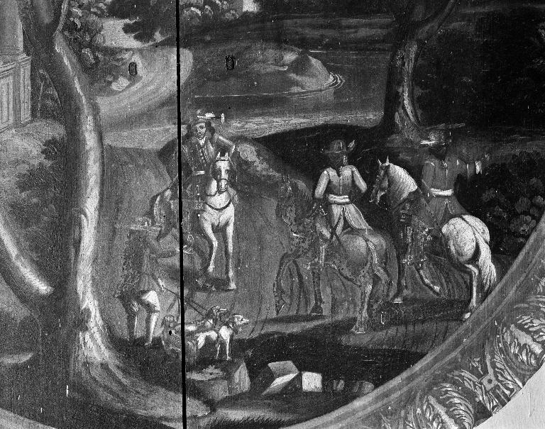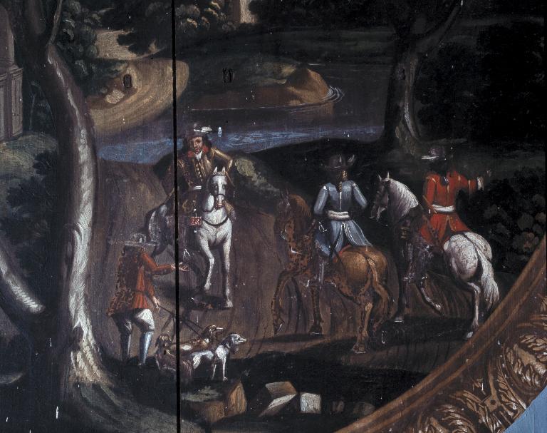 Les trois dessus-de-porte sont occupés par trois paysages ; l’un, dans un cadre urbain, représente un port avec quelques grands voiliers ; sur les quais évoluent des personnages. Dans le deuxième, trois cavaliers, accompagnés d’une meute de chiens, font une partie de chasse dans une forêt où s’élève un temple bordé d’un ruisseau. Dans le troisième, deux cavaliers que des paysans saluent se promènent au bord d’un lac ; au deuxième plan, une fontaine monumentale.