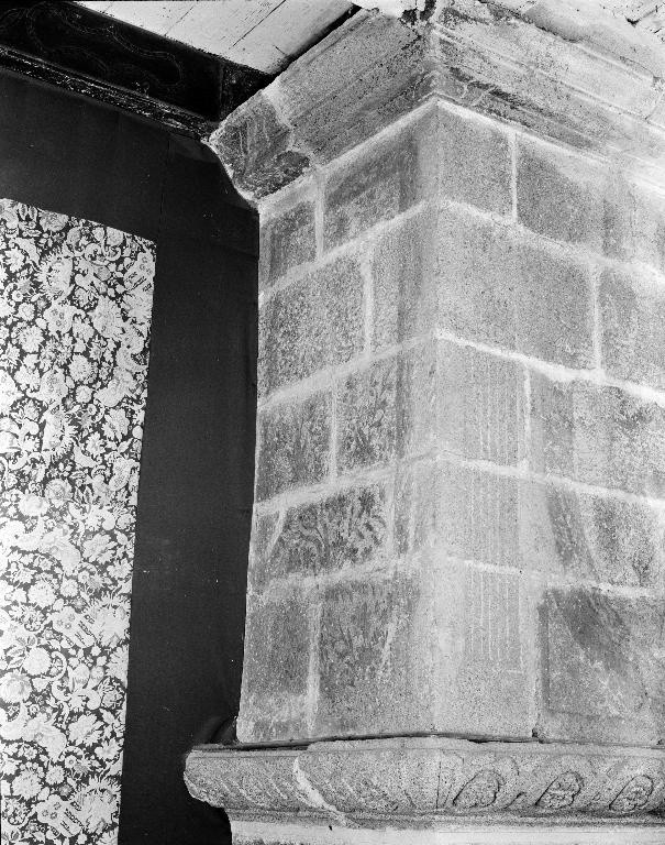 Décor sculpté : moulure à entrelacs et rosette sous la hotte.