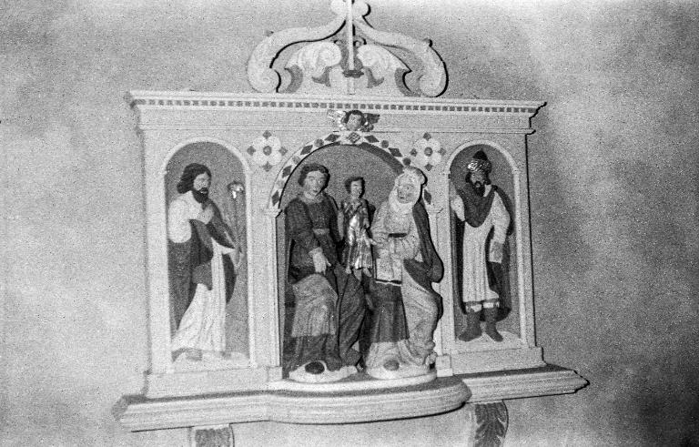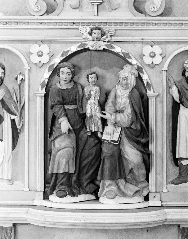 Enfant Jésus monoxyle fixé par une cheville dans le fond du retable ; saint Joseph et saint Joachim en bas-relief.