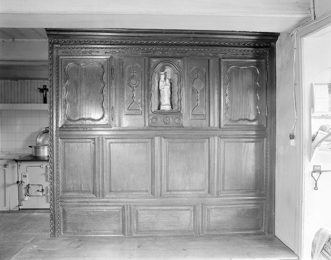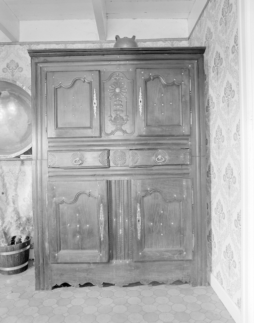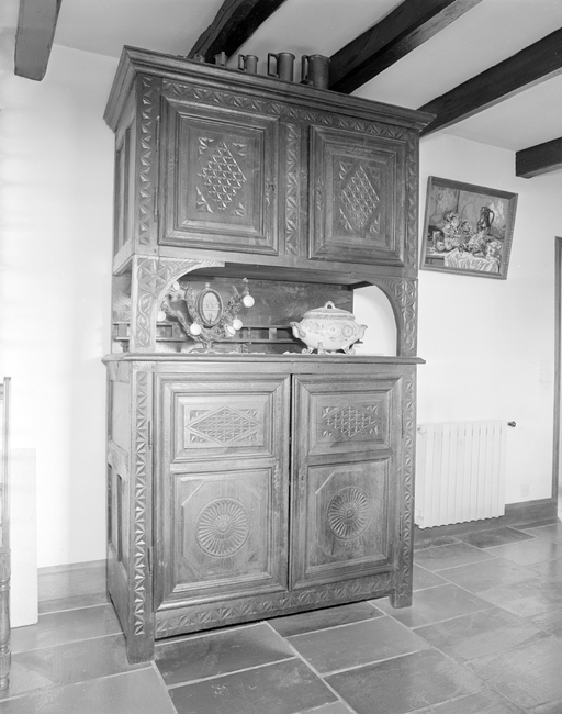 Ce dernier était installé contre la cloison qui séparait la salle commune du couloir central de la maison. Sa façade dont les portes coulissaient latéralement sur des glissières pour accéder à la paillasse était positionnée en face de la table et constituait la seule partie du meuble ouvragée et décorée.