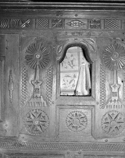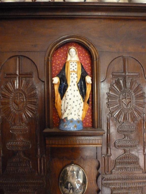 Parmi eux, les motifs religieux ont une place centrale : niche abritant une statuette de la Vierge à l’Enfant, ostensoirs dans plus de 80% des meubles observés ou encore cœurs surmontés d’une croix, ciboires et têtes d’angelots. Ces décors faisaient entrer le religieux dans la vie quotidienne et transformaient le drustuilh en un véritable autel domestique auprès duquel ont faisaient la prière du soir et on veillait les morts.