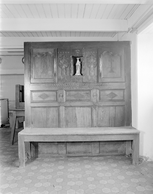 La partie basse du meuble présente 3 à 5 (voir plus) panneaux rectangulaires ou chantournés simples. Le haut, visible même si quelqu’un est assis sur le banc, est quant à lui composé, dans la majorité des cas, d’une niche à Vierge centrale flanquée de deux battants de porte, le tout décoré de nombreux frises sculptées et ostensoirs. Le sommet du meuble est coiffé d’une corniche soigneusement moulurée.