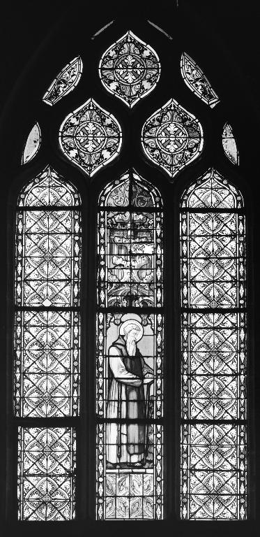 Chaque baie est formée de trois lancettes en arc brisé, divisées par 3 barlotières et des vergettes. La lancette centrale est consacrée au personnage, les lancettes latérales et le tympan sont ornés de grisailles ornementales;
