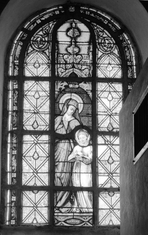 Ensemble de deux verrières à personnages de la baie 9 : saint évêque, et de la baie 10 : Éducation de la Vierge, église paroissiale Saint-Pierre (Plougar),