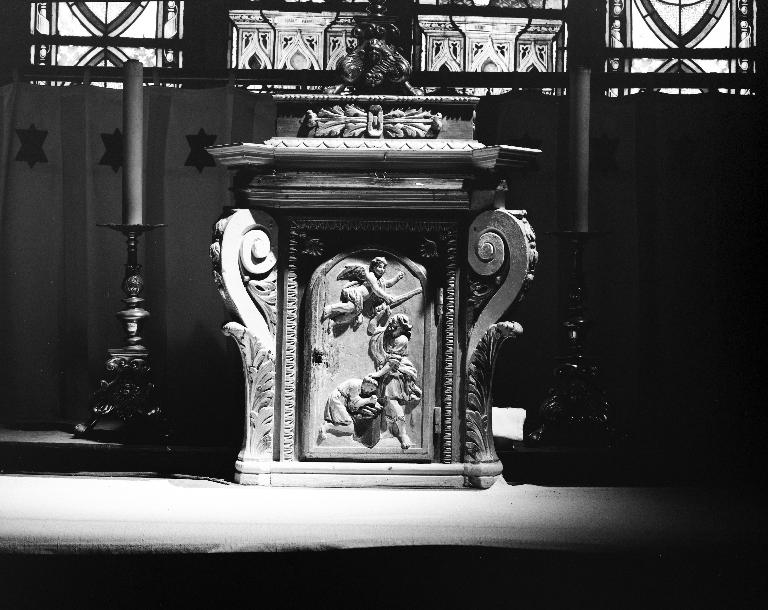 Description : Sacrifice d’Isaac sur la porte du tabernacle ; Agneau mystique sur le devant d'autel.