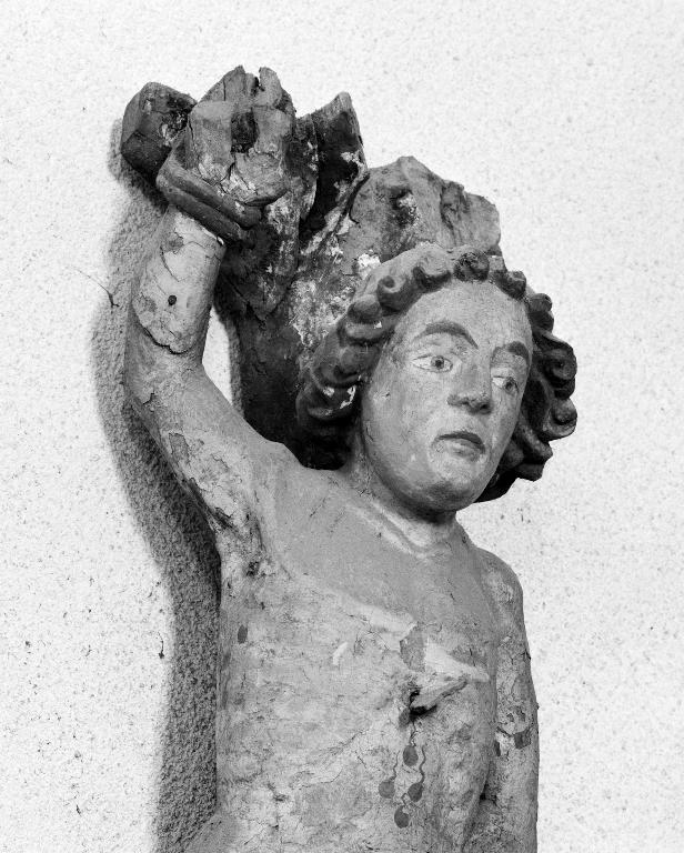 Statue très encrassée, peinture écaillée, main droite et flèches disparues.