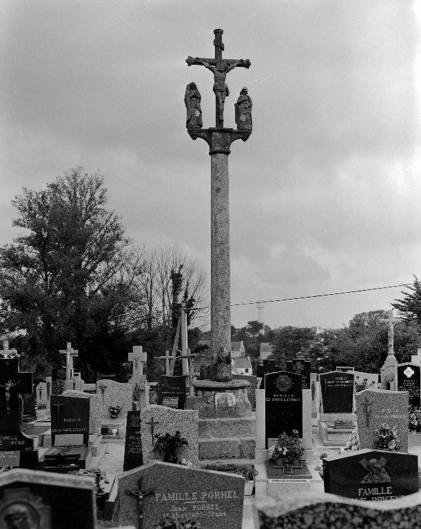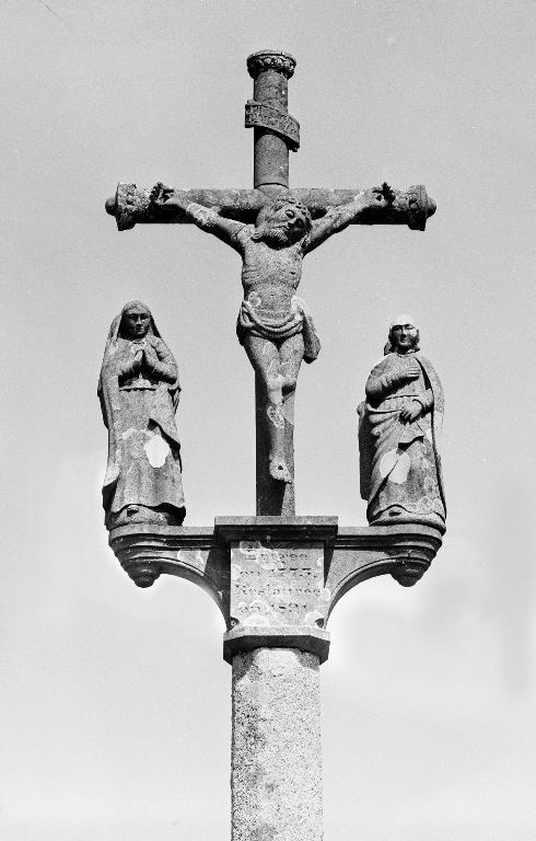 Calvaire remonté en 1773 à partir d'éléments datant probablement du 17e siècle et restauré en 1891 par Philibert Zerbinot, de Landerneau, qui refait le croisillon portant les statues géminées.
