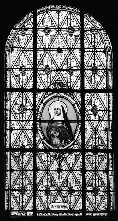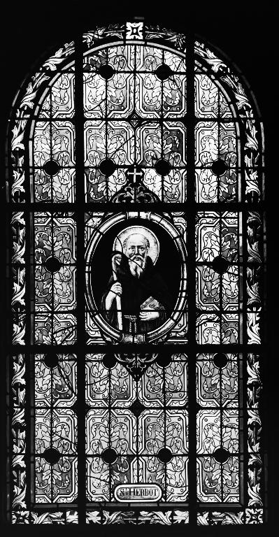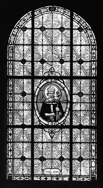 Ensemble de neuf verrières à personnages des baies 1 à 9 : Sacré-Coeur de Jésus, saint Herbot, saint Pol de Léon, saint Guévroc, Sacré-Coeur de Marie, saint Alar, sainte Ventroc, église paroissiale Sainte-Édiltrude (Tréflez),