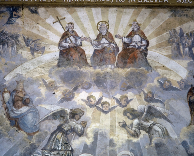 Iconographie : la Trinité en haut, l'Eglise triomphante au milieu, l'Eglise militante en bas ; les représentants de l'église et du pouvoir (l'empereur et le roi Louis XIV) se groupent autour de l'église Saint-Pierre de Rome.