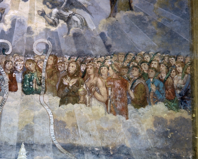 Inscription concernant l'iconographie : SANCTA SUMMA ET INDIVIDUA TRINITAS NOSTRO IN SAECULA SAECULORUM AMEN (en haut). (?) TE PER ORBEM TERRARUM SANCTA CONFITETUR ECCLESIA (en bas). TE DEUM LAUDAMUS TE DOMINUM CONFITEMUR/TE ETERNUM PATREM OMNIS TERRA VENERATUR (phylactères) ; blason Le Saulx de Toulancoat (en bas à gauche).