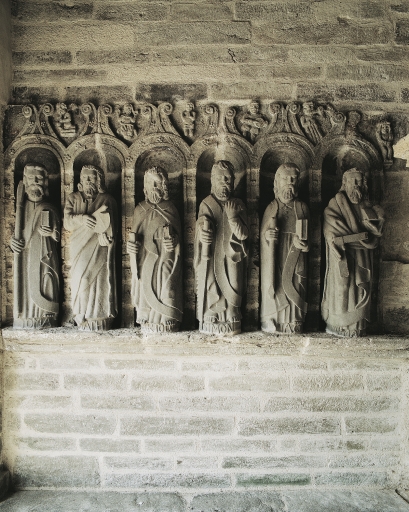 L'ensemble a été exécuté pour les niches architecturées coiffées d'un décor sculpté en bas relief : deux couples et ange en prière (face est), musiciens, sirène, orant et Christ aux outrages (face ouest). Il est probable que les statues étaient peintes et que les phylactères portaient des inscriptions. Cette série se compare aux apôtres du porche de Lanhouarneau (Finistère).