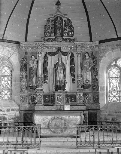 Autel à tombeau galbé. Retable architecturé à niche centrale encadrée de colonnes et flanquée de deux ailes abritant des statues. Couronnement en forme de niche enfermant la statue de l'Enfant Jésus flanquée de volutes et surmontée d'un amortissement..