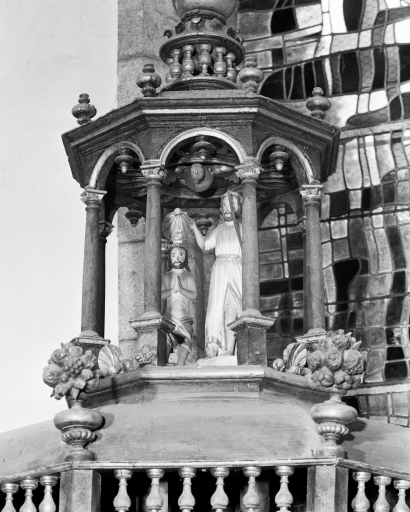 Le baldaquin abrite la cuve baptismale. Le couronnement ajouré abrite un petit groupe figurant le baptême du Christ..