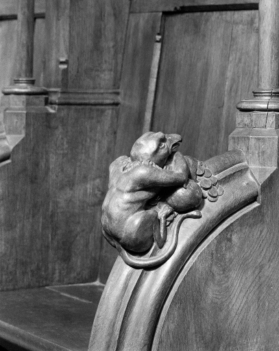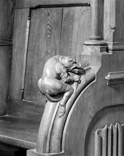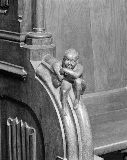 Lambris de hauteur couvrant la totalité du choeur. Deux paires de stalles à trois places avec accotoirs sculptés figurant des animaux fabuleux et un jeune garçon. Autels-retables architecturés avec niche centrale à dais encadrée de socles portant des statues.