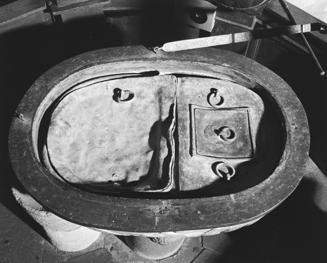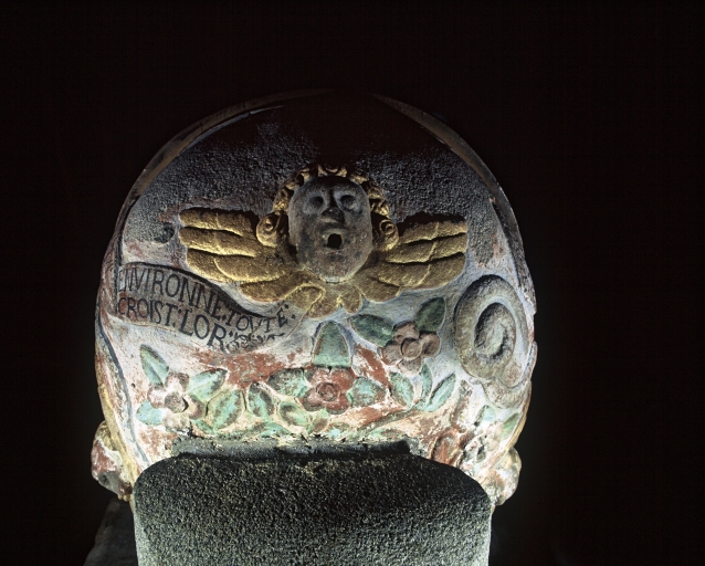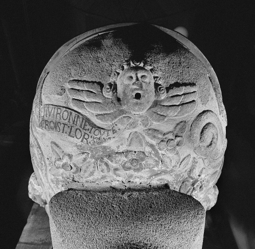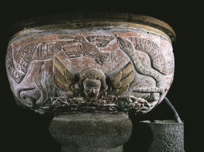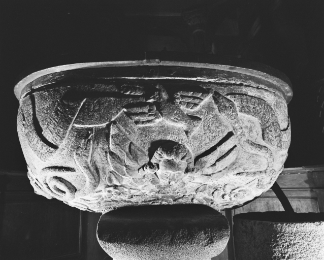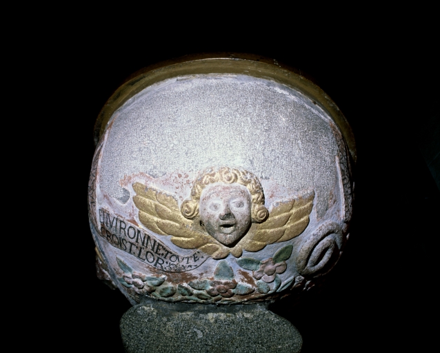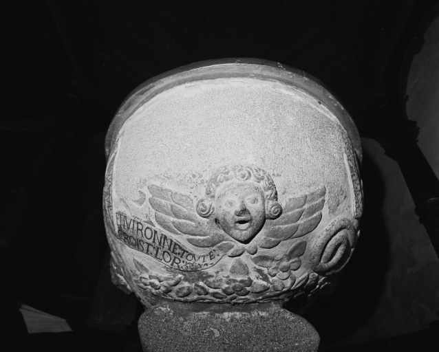 Il s'agit du remploi d'une vasque de fontaine ; les quatre têtes d'angelots aux bouches percées (obstruées depuis l'usage en tant que fonts baptismaux) servaient à cracher l'eau..