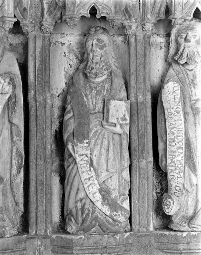 Les statues sont placées dans des niches coiffées de dais gothiques tous différents. Superposition de plusieurs inscriptions peintes sur phylactères..