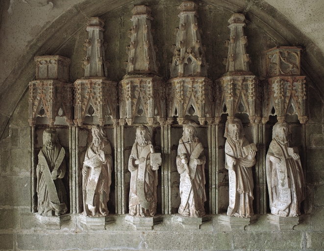 Les douze statues semblent avoir été exécutées au 16 siècle, à l'exception de certaines têtes, probablement refaites au début du 17e siècle. Les dais qui les abritent sont contemporains du porche (seconde moitié du 15e siècle). Les inscriptions peintes sur les phylactères pouvaient porter, outre le nom de l'apôtre, des versets de la Bible. En 1723, Olivier Grall, peintre et doreur de Landerneau, repeint l'ensemble.