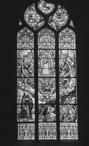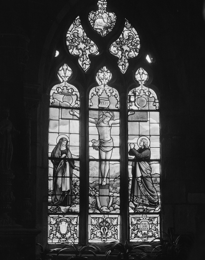 Verrière 0 datée 1885 exécutée et signée par le maître verrier Léopold Lobin de Tours. Verrières 1, 2, 3 et 4 datées respectivement 1868 et 1871 exécutées et signées par le maître-verrier Emile Hirsch de Paris. Verrières 5 et 6 datées 1885 et 1903 exécutées et signées par les maîtres verriers J.B.Florence et Heinrich de Tours. Les armoiries figurant sur les verrières 0 et 6 datent partiellement des 15e et 16e siècles.