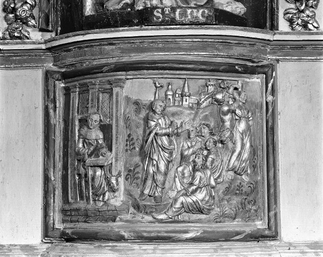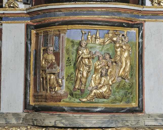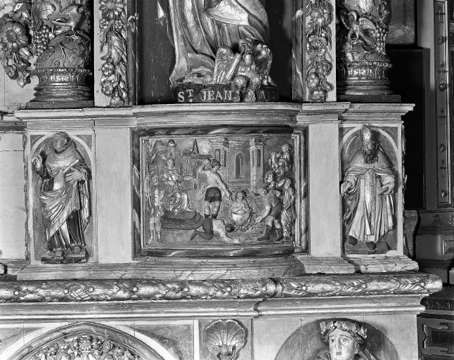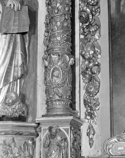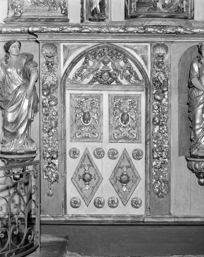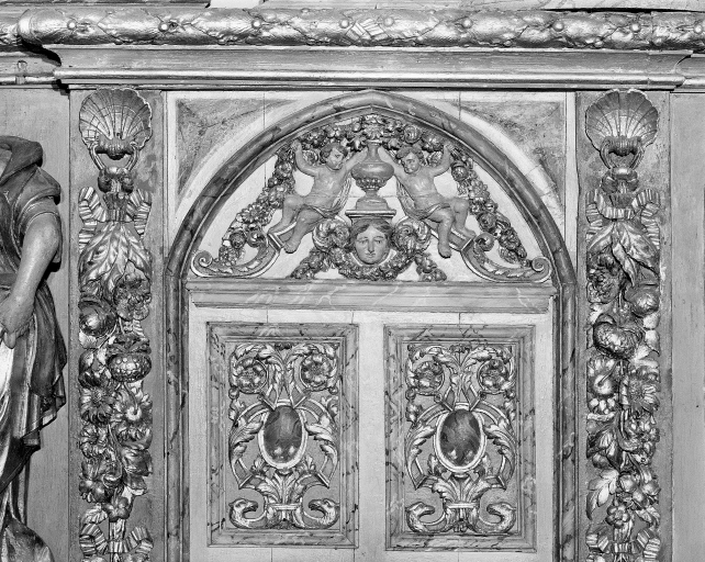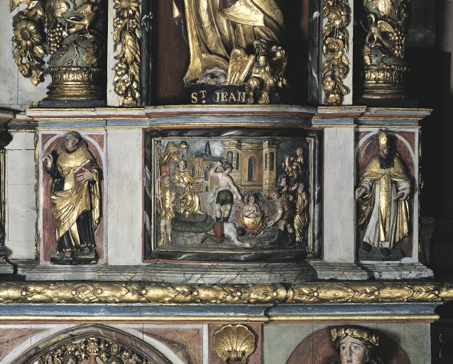 - bois, en plusieurs éléments peint à la poudre d'or, taillé, décor en bas relief, décor en haut relief, décor en ronde bosse