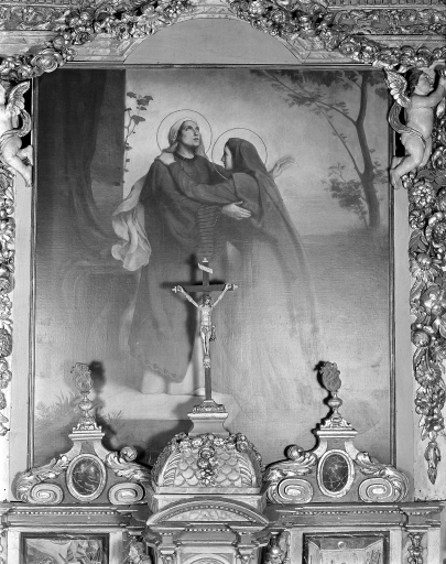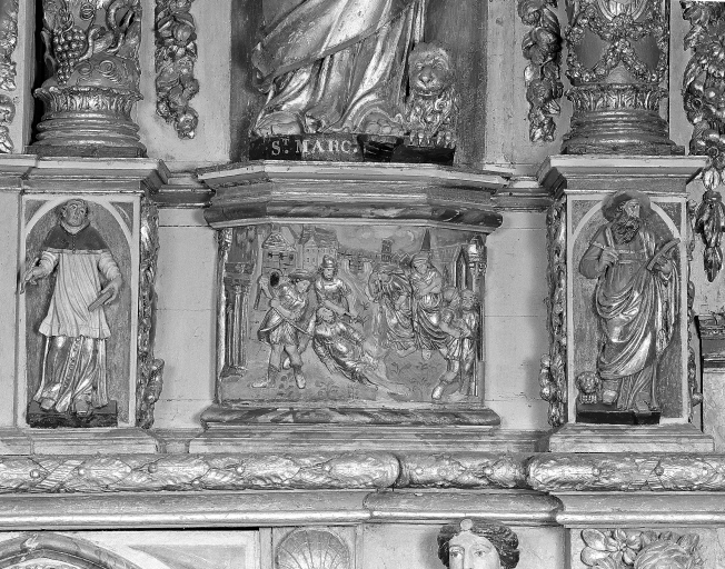 Retable anciennement dédié à saint Marc. L'antependium non étudié enferme un gisant en cire de saint Sylvain. Le tableau central non étudié figure la Visitation. Le vantail de porte droit du soubassement est fictif, celui de gauche donne accès à la sacristie nord. Retable à ailes ; retable à niche ; retable architecturé ; retable à panneau compartimenté.