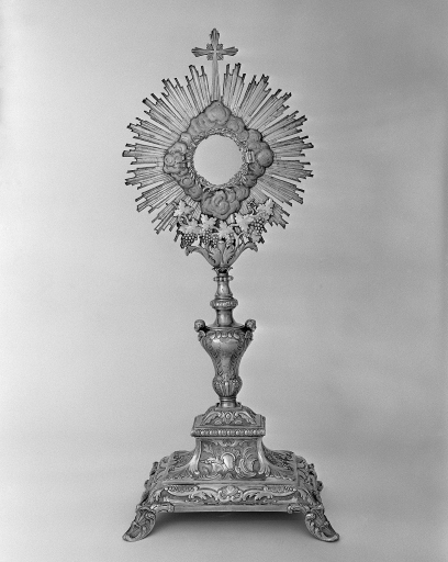 h = 71 ; l = 29 ; la = 20 ; pds = 2700. Longueur et largeur du pied. Largeur de la monstrance : 27 l..