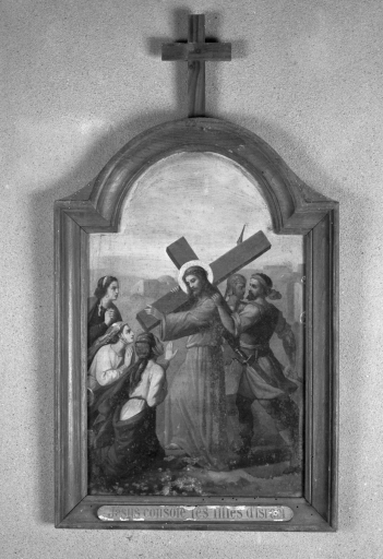 Sept cadres portent des plaques en bois indiquant l'iconographie : Jésus tombe pour la première fois. Jésus rencontre sa sainte mère. Jésus console les filles d'Israel. Jésus dépouillé de ses vêtements. Jésus cloué sur la croix. Jésus descendu de la croix. Jésus mis en sépulture.