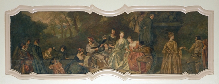 Ces deux panneaux peints semblent s´inspirer des "Fêtes galantes" (ou Pèlerinage à l'île de Cythère) d´Antoine Watteau (1684-1721). Son oeuvre abondamment gravée qui idéalise une société élégante, mélancolique et nonchalante, était toute prédestinée à être copiée pour parer les demeures bourgeoises et aristocratiques.