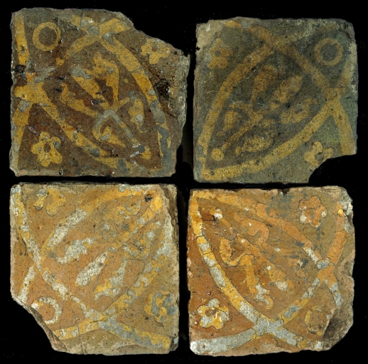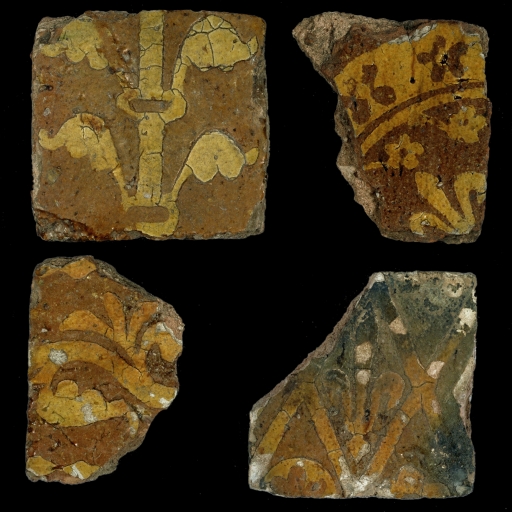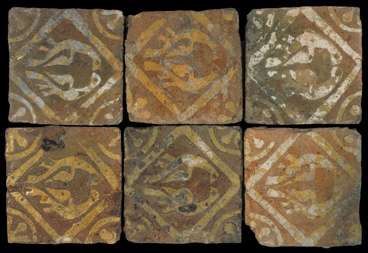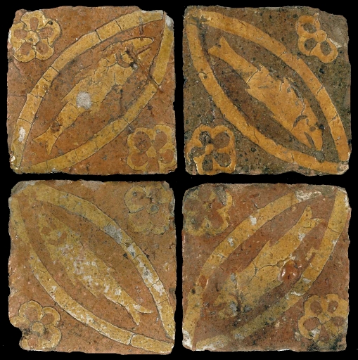 Carreaux rectangulaires à décor incrusté bicolores ou monochromes, partiellement vernissés, à décor animalier (poissons, oiseaux affrontés) et végétal (fleur de lis, fleurons) et ornemental (entrelacs).