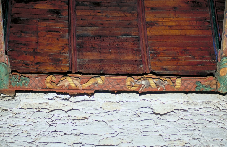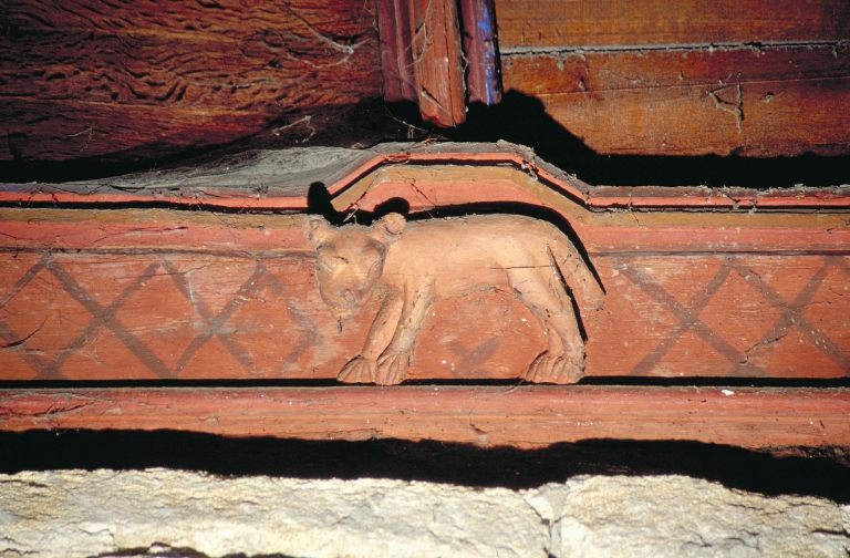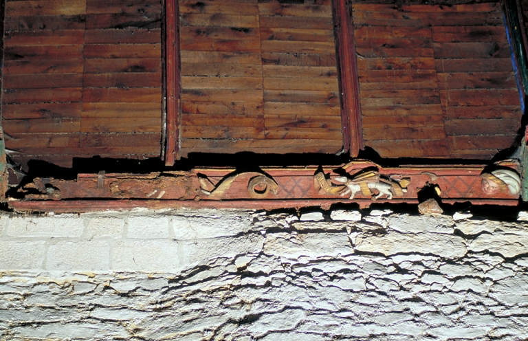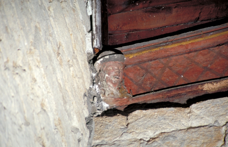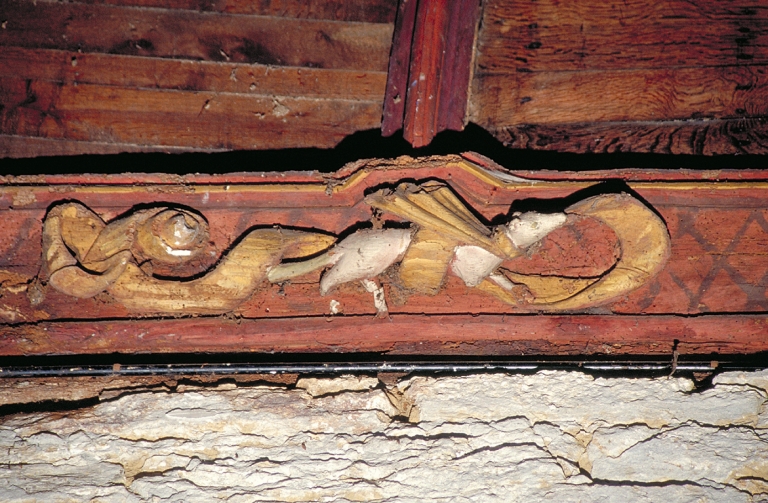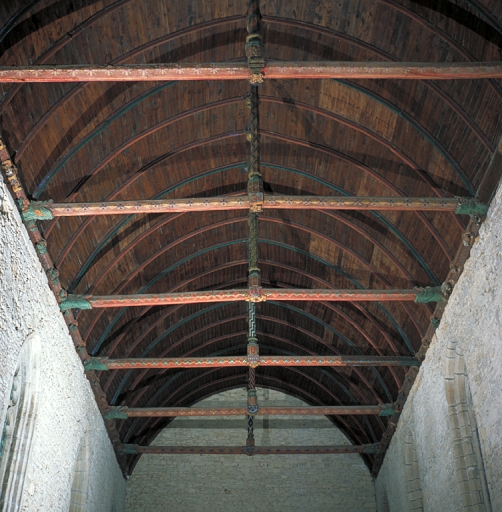 Ensemble composé de 16 sablières et de 7 entraits à poinçons faisant partie d'une charpente de type à chevrons-portant-fermes lambrissée en berceau. Certains poinçons portent des marques de charpentiers. Les sablières sont numérotées de 1 à 16, en commençant par le mur sud, partie est, et en tournant dans le sens des aiguilles d'une montre. Les sablières 4, 5 et 12 ne portent qu'un décor floral stylisé. Les poinçons sont identifiés de A à G, d'est en ouest.