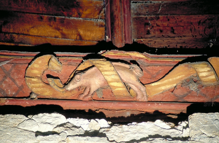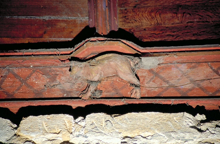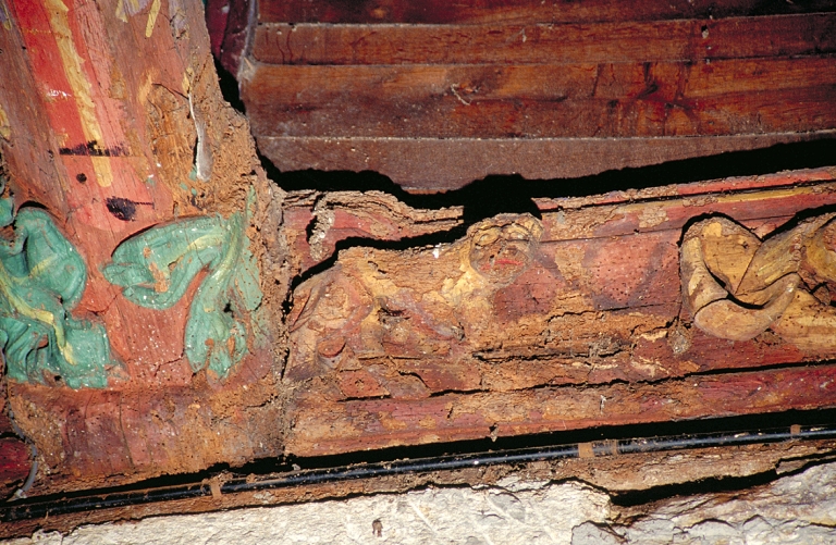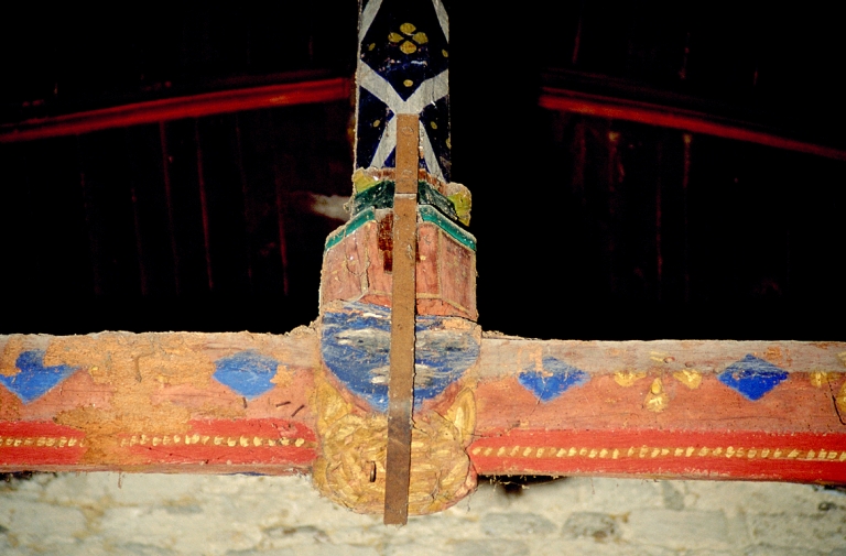 Vermoulure généralisée. Polychromie (moderne) abîmée. Renforcement partiel des entraits et des poinçons par des pièces métalliques.