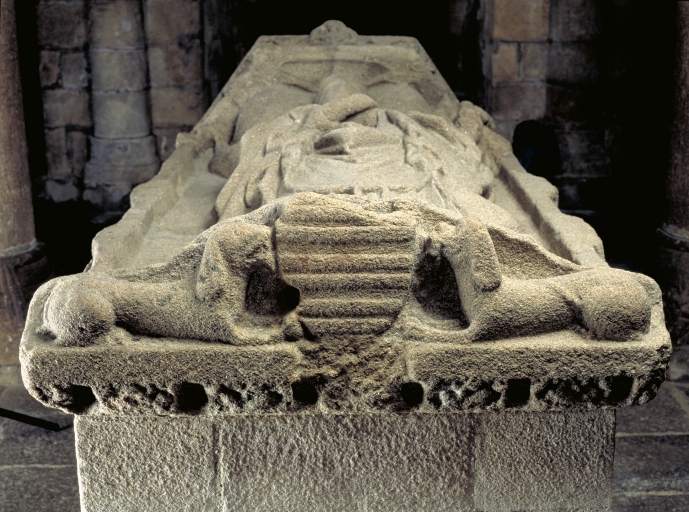 Sculptée dans un granite local par un artiste confirmé, l´effigie de cet ancien abbé de Sainte-Croix exprime, à l´instar des tombeaux des grands feudataires de l´époque, un message de pouvoir, ici encore renforcé par la présence d´armoiries placées à la tête et aux pieds du gisant ; elles sont présentées par des anges et surtout une Vierge à l´Enfant en majesté, allusion possible à l'église Notre-Dame dont il fut un des commanditaires.