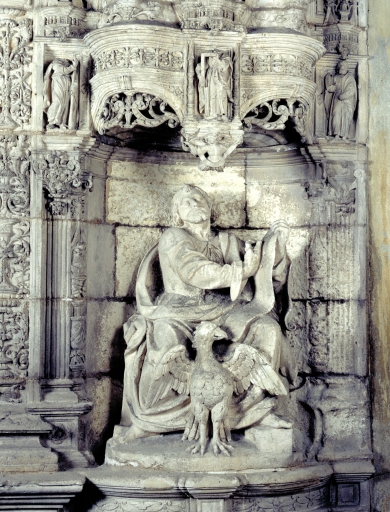 Moïse ; Samuel ; Nathan ; David ; Isaïe ; Jérémie ; Ezéchiel ; Daniel (partie supérieure). Saint Matthieu, saint Marc, saint Jean et saint Luc (niches). Apôtres (dais). Vierge, Foi, Espérance, Charité, Prudence, Justice, Force, Tempérance (couronnement dais). Saint Grégoire, saint Jérôme, saint Ambroise, saint Augustin (architrave). Personnages non identifiés (architrave).