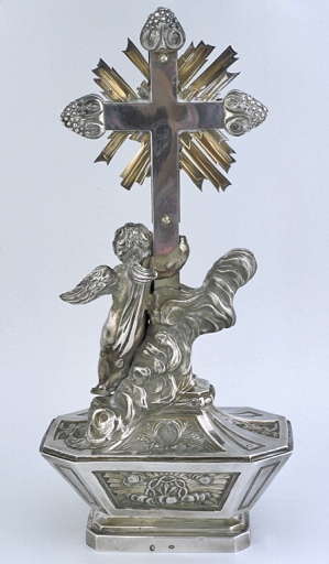 Reliquaire en forme de tombeau surmonté d'une croix contre lequel s'adosse un angelot. Endroit du reliquaire figurant l'Agneau mystique. Revers du reliquaire figurant les instruments de la Passion.