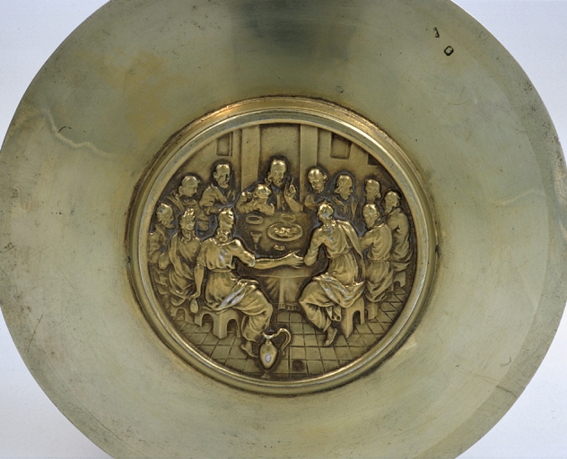 La Cène (patène) ; Christ, Vierge, saint Joseph, en médaillons (fausse coupe) ; Christ souffrant, Vierge (noeud).