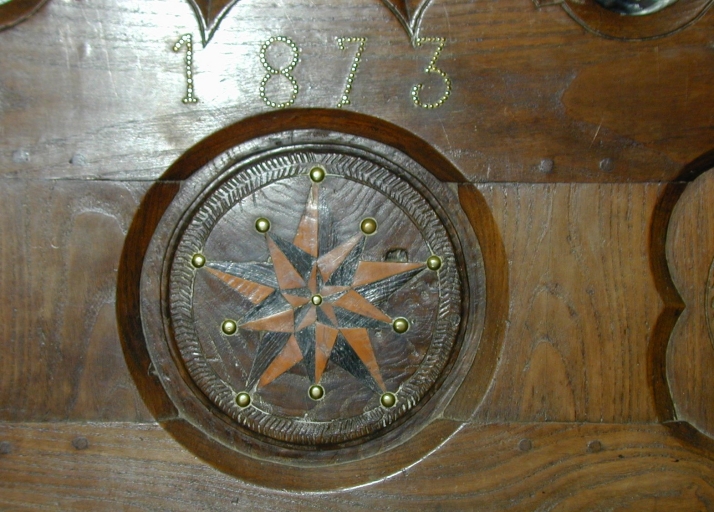 Décor gravé ou sculpté dans la masse (étoile, ornement floral, oiseaux). Incrustations en merisier et en buis pour les étoiles. Application de clous en laiton. Ouverture centrale à cadre chantourné.