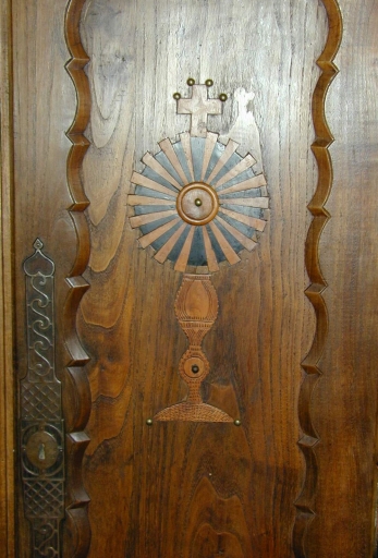 Panneaux à grands cadre chantournés. Bâti et vantaux à décor incrusté en merisier et en buis figurant des étoiles et des ostensoirs. Application de clous en laiton. Entrées de serrure et fiches en fer. Bâti inférieur et pieds chantournés.