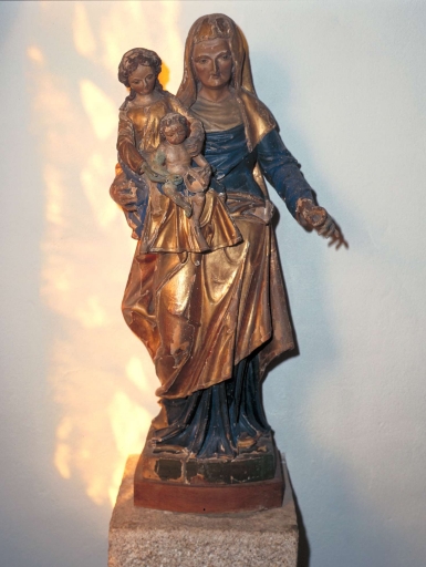 Sainte Anne, représentée en femme âgée, porte, sur son bras droit, une Vierge aux traits juvéniles et de petite taille qui présente l'Enfant qui, placé sur ses genoux, tient un globe. L'attribut de la main gauche de sainte Anne a disparu.