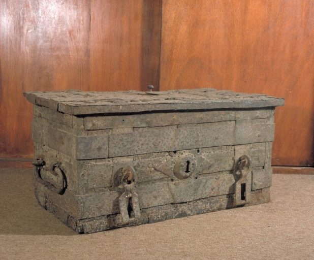 Élément devenu rare, ce coffre-fort en chêne, cerclé de fer et pourvu de deux arceaux pour cadenas, servait à entreposer les objets précieux et les archives de la paroisse. Malgré ses dimensions relativement modestes, son poids est considérable. Il témoigne du pouvoir de la paroisse et des fabriciens qui en assuraient l´administration.