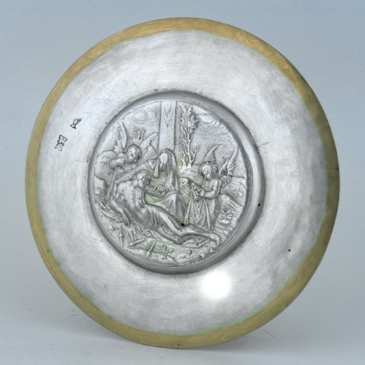L´oeuvre est exceptionnelle par la qualité des scènes exécutées au repoussé et ciselées. Sur la fausse coupe bordée de festons se déroule la Cène, thème exceptionnel que l´on retrouve dans les ateliers parisiens des frères Loir dans la première moitié du 17e siècle. Sur le pied, plusieurs scènes de la Passion sont plus convenues : le Christ au jardin des oliviers, la Crucifixion, comme sur la patène qui lui est associée, thèmes classiques en rapport avec l´usage du calice. La coupe encore large et évasée permet de dater ce calice vers 1650. En l´absence du poinçon d´orfèvre, disparu, la lettre-date, un M couronné, ne permet pas à elle seule de préciser l´origine de l´oeuvre, ni bretonne, ni parisienne.