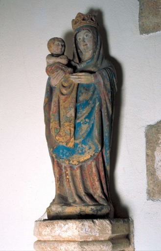 Statue monolithe peinte, peut-être en calcaire, avec traces de polychromie ancienne. La Vierge, voilée et couronnée, tient l'Enfant présentant un globe sur son bras droit.