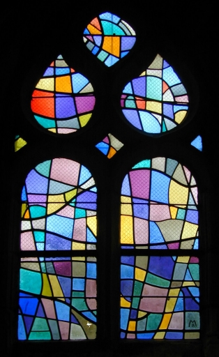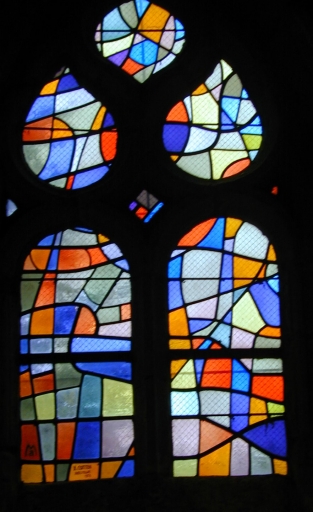 Verrières abstraites de dimensions différentes formant un ensemble homogène. Les trois verrières du chevet sont d'Alfred Manessier, trois autres verrières des bas-côtés sud et nord sont de Jean Le Moal, une dernière dans le bas-côté nord est une oeuvre commune.