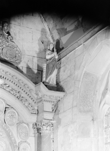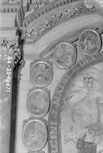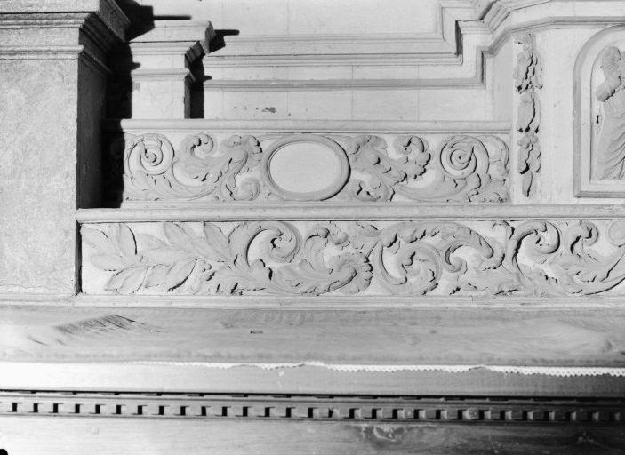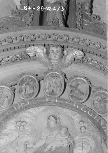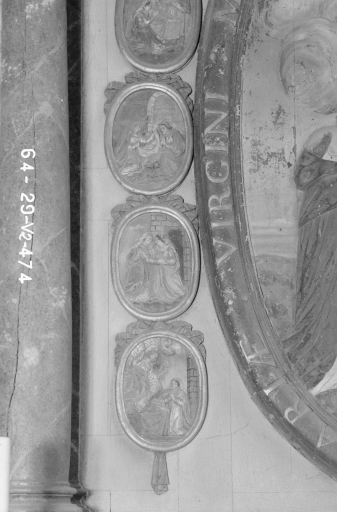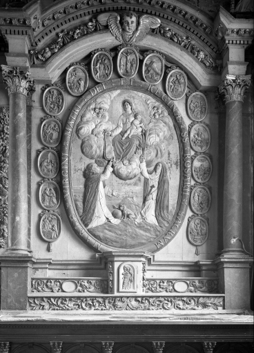 Inscription sur la base d'une colonne : CET AUTEL A ETE FONDE LE E 18 OCTOBRE 1694 PAR ROSALIE [...] DAME DE LA VILLE MOREL. Inscription autour du panneau central : MARIAE : VIRGINI : MATRI : DEI : ET : REGINAE : SS : ROSARII : SACRUM.