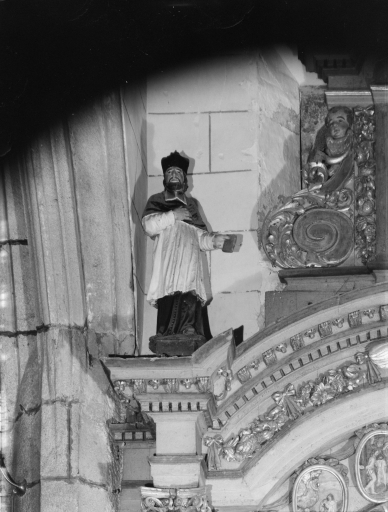 Retable en bois avec colonnes de chapiteaux corinthiens et pilastres de même ordre encadrant le panneau central. Les colonnes supportent un entablement courbe sur lequel il y a une niche encadrée de chutes de fleurs recevant une statue. L'autel est moderne.