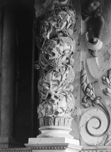 Fronton curviligne soutenus par des colonnes torses, avec rinceaux fleuris et personnages, encadrant une niche centrale recevant une statue de la Vierge à l'Enfant au croissant. Des caryatides ornent l'extérieur de la niche.