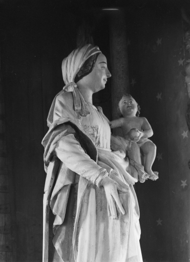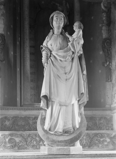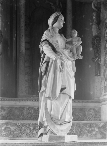 Retable en bois richement orné datant du 17e siècle. La statue de La Vierge est plus probablement du 16e siècle est d'inspiration flamande.