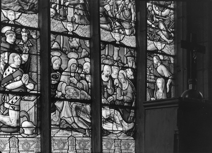 Eléments provenant de deux vitraux. Le vitrail comprend deux rangs superposés de scènes, chaque rang se trouvant subdivisé en quatre compartiments par les meneaux du remplage. A la rangée inférieure, la Mise au tombeau occupe les deux compartiments du milieu, ceux des côtés étant réservés au donateur Vincent de Ploeuc et sa femme Jeanne de Rosmadec, tous deux agenouillés et présentés par leurs saints patrons respectifs. A l'étage supérieur, la Crucifixion occupe trois compartiments, la Résurrection le quatrième. Dans les soufflets, des anges présentent des instruments de la Passion.