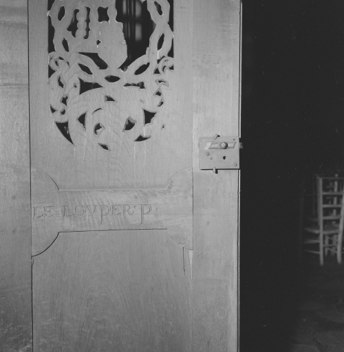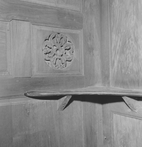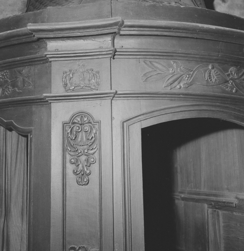 Confessionnaux de forme semi-circulaire, à toit caréné. Porte ciselée.