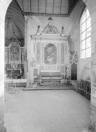 Retable lambris à décor rocaille inséré dans de nombreuses moulures. L'autel reçoit aussi un décor rocaille.