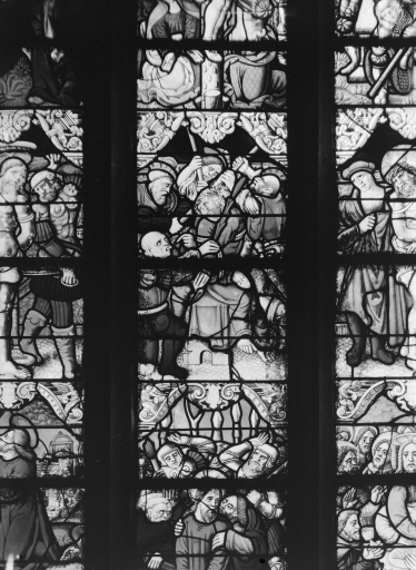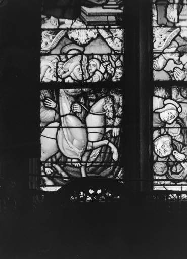 - verre, découpé, peint, polychrome, jaune d'argent, sanguine