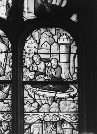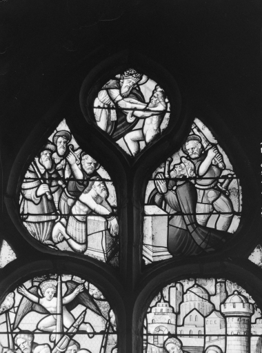 - verre, découpé, peint, polychrome, jaune d'argent, sanguine